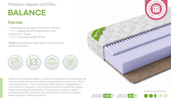 Наиболее популярная модель в серии. Использование ортопедической пены высокой плотности позволяет выдерживать нагрузку до 130 кг на спальное место. При этом матрас будет отлично поддерживать позвоночник и сохранять свою форму длительное время без деформации и проседания материалов. На выбор две стороны - одна с массажной пеной будет иметь умеренную жесткость, а сторона с кокосовой койрой - высокую степень жесткости.