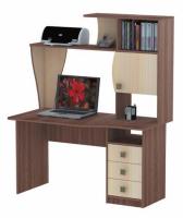 Верхняя часть стола представляет собой надстройку, удачно комбинирующую прямые строгие формы с радиусными мягкими. Надстройка имеет ассиметричные формы. Справа расположен шкафчик с распашной дверцей, образующий под собой открытую нишу. Верхняя часть надстройки имеет открытые полки для книг и оргтехники. Крыша надстройки также выполняет функцию дополнительного рабочего пространства. Квадратные ручки дополняют современный дизайн стола.