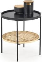 Kampa – оригинальный журнальный столик польской компании Halmar с круглой столешницей из МДФ. Каркас изготовлен из окрашенной в черный цвет стали. Столик оснащен дополнительной полочкой с плетением из натурального ротанга.